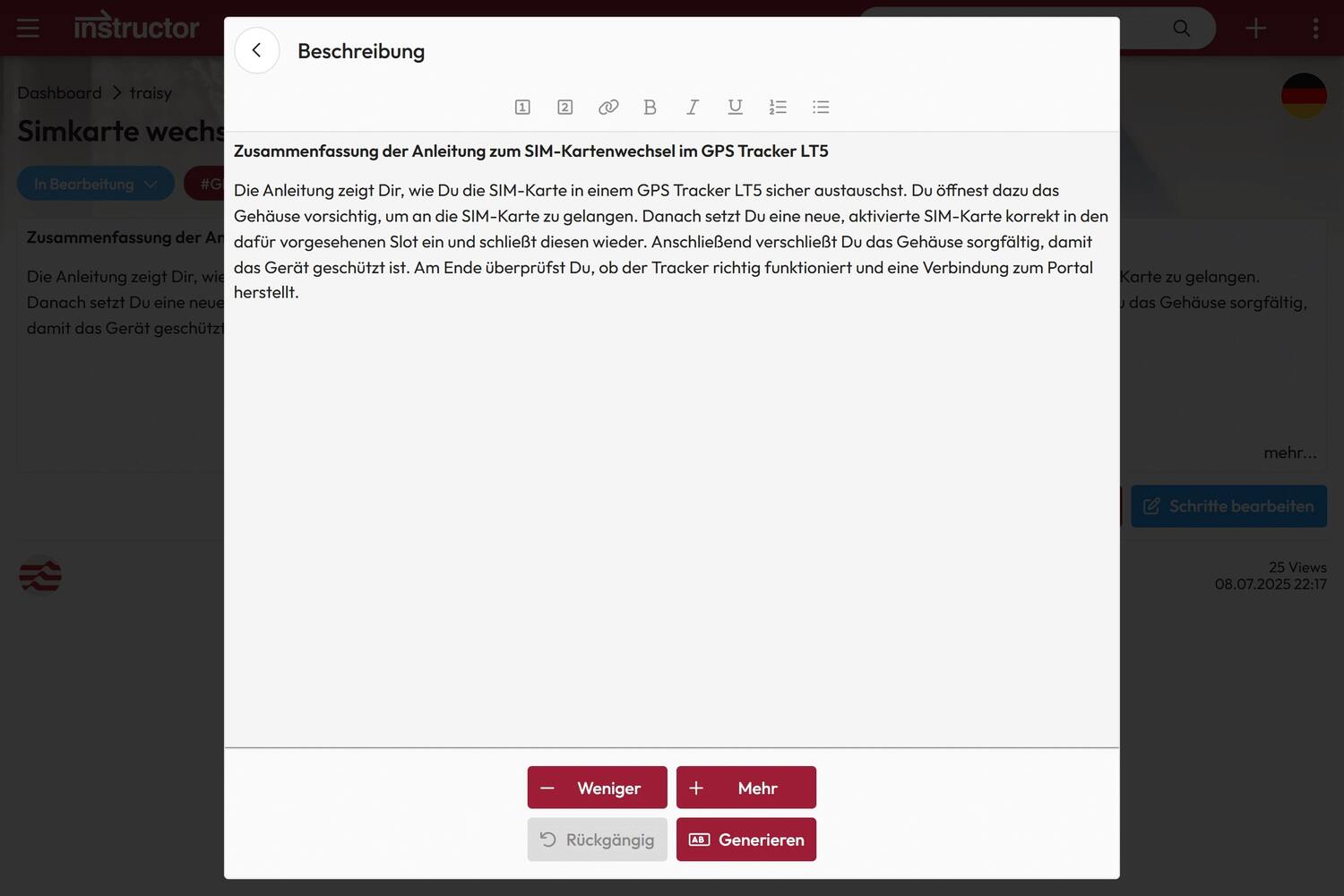 With just one click, a clear short text is generated based on the title of the instructions, the step names and descriptions – ideal for a quick overview and full-text search.