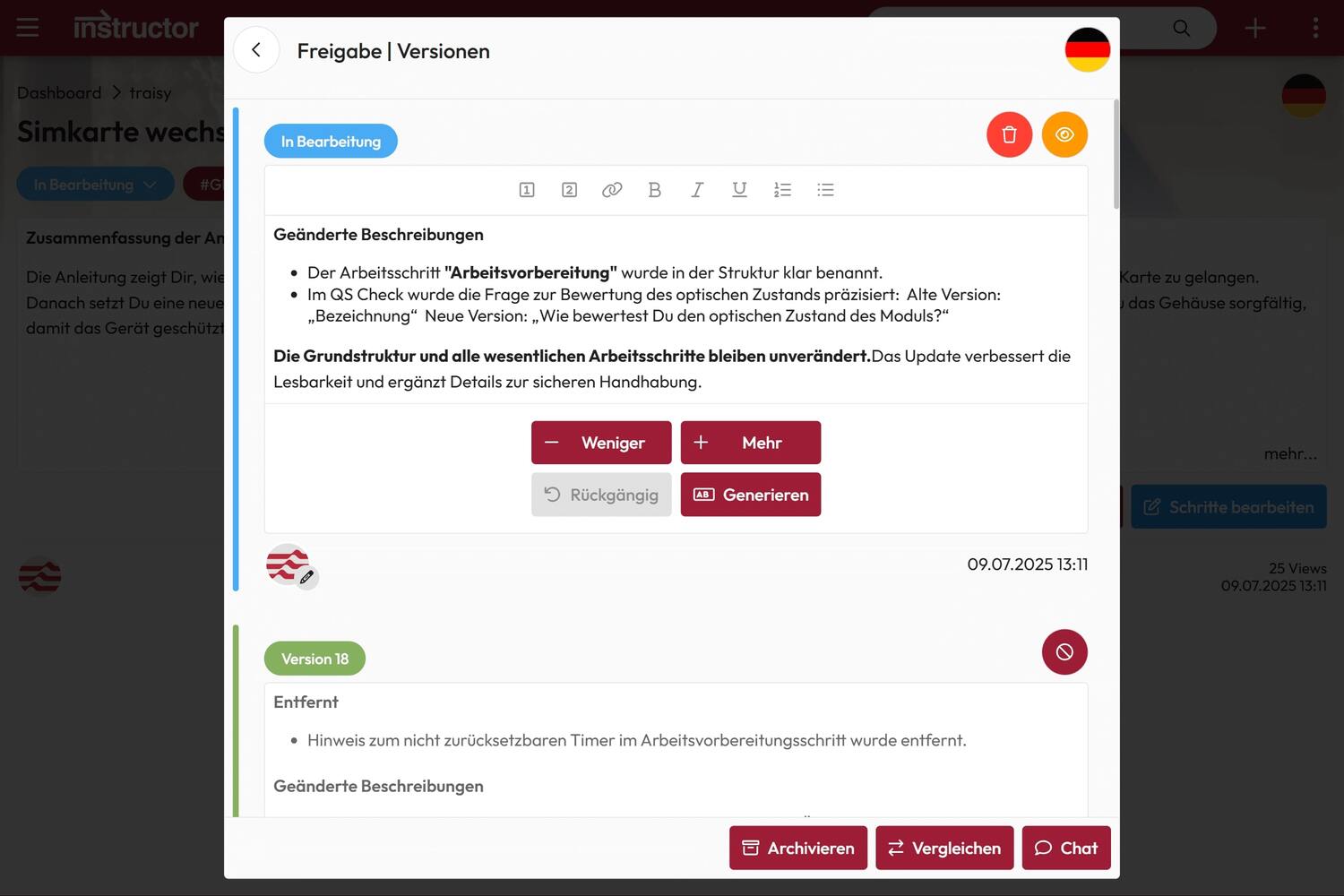 The instructor AI automatically creates the release notes from the change tracking and version comparison – quickly, clearly and, above all, completely.