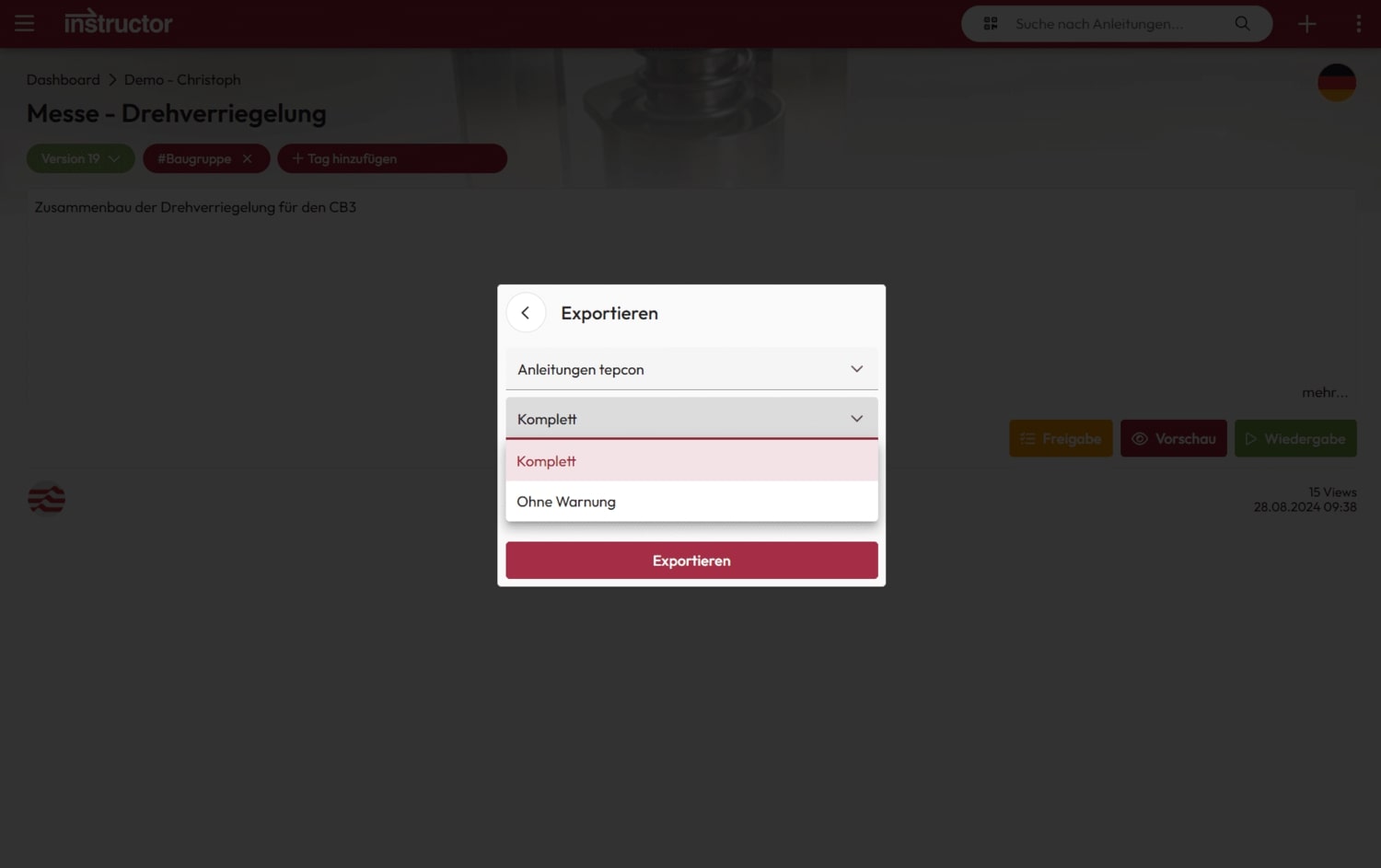 Zudem lassen sich Sprache, Version und Variante der Anleitung gezielt auswählen. – So entsteht ein maßgeschneiderter Export, der genau den jeweiligen Anforderungen entspricht.
