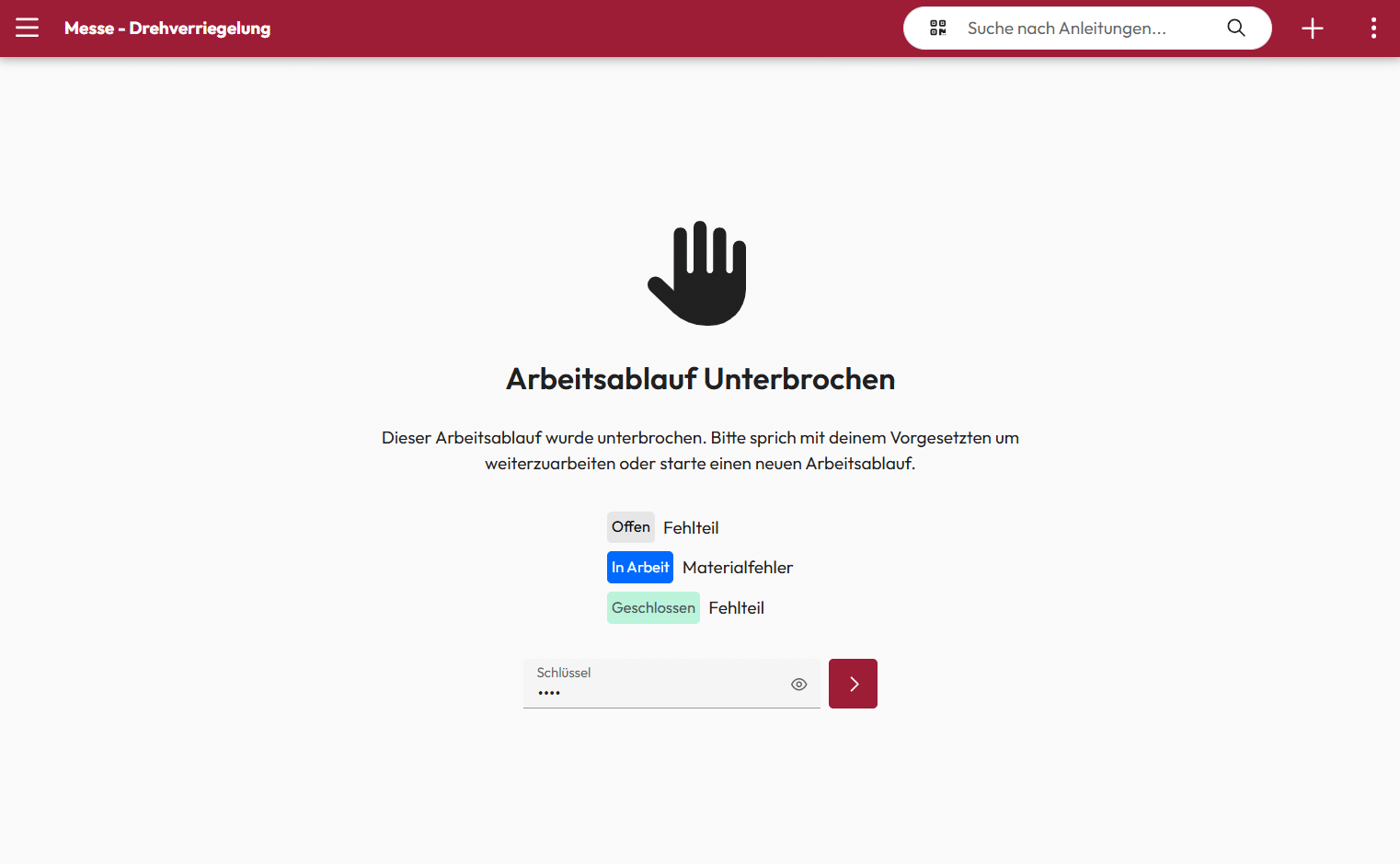 Die Wiederaufnahme ist nur mit einem Freischaltcode möglich – so wird sichergestellt, dass die Arbeit nur fortgesetzt wird, wenn eine fehlerfreie Bearbeitung ohne Einschränkungen sichergestellt ist.